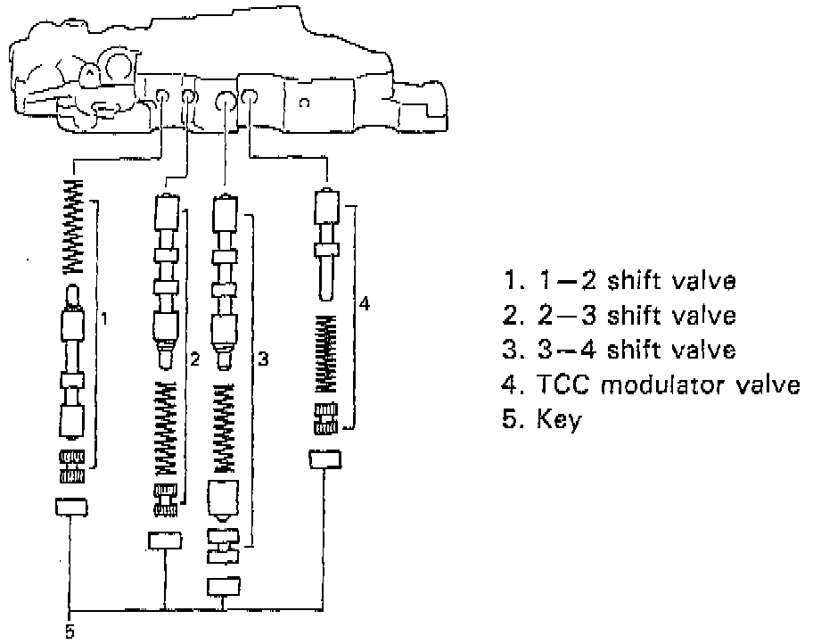 9. Remove following parts and springs by removing rear valve body cover bolts and key.