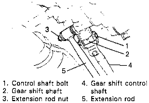 4. Remove gear shift control shaft bolt and nut, then detach control shaft from gear shift shaft.