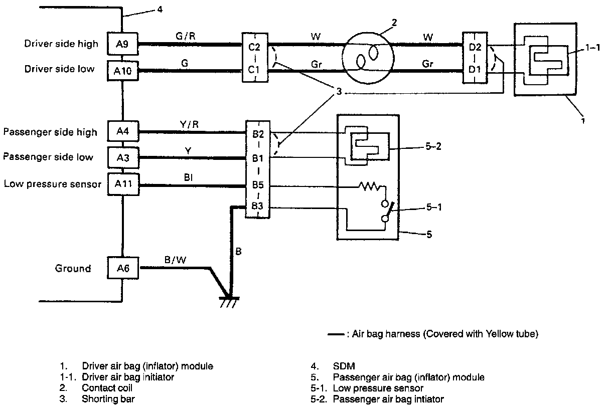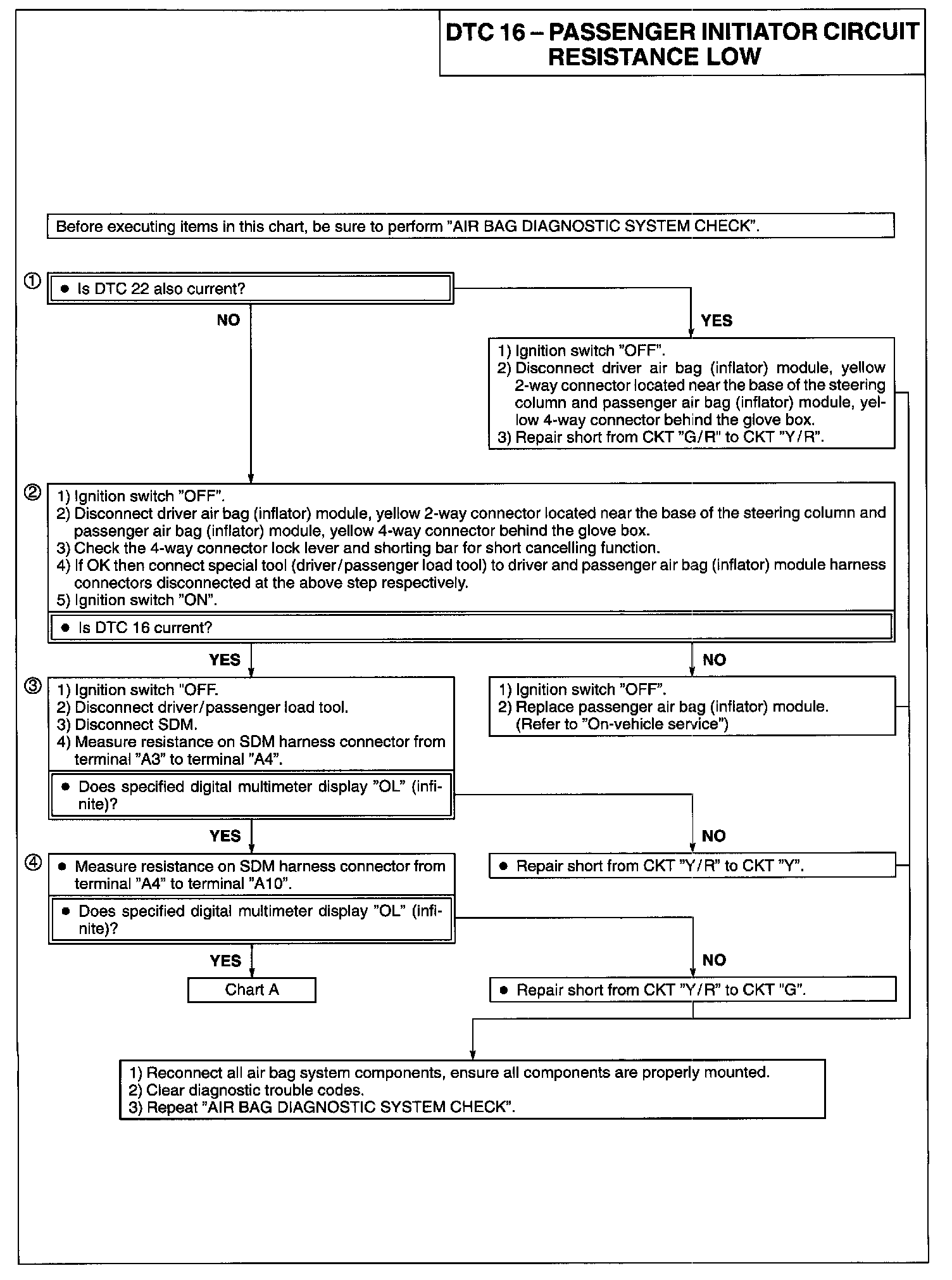 2) This test determines whether the malfunction is in the passenger air bag (inflator) module circuitry or in the SDM wiring harness circuitry.