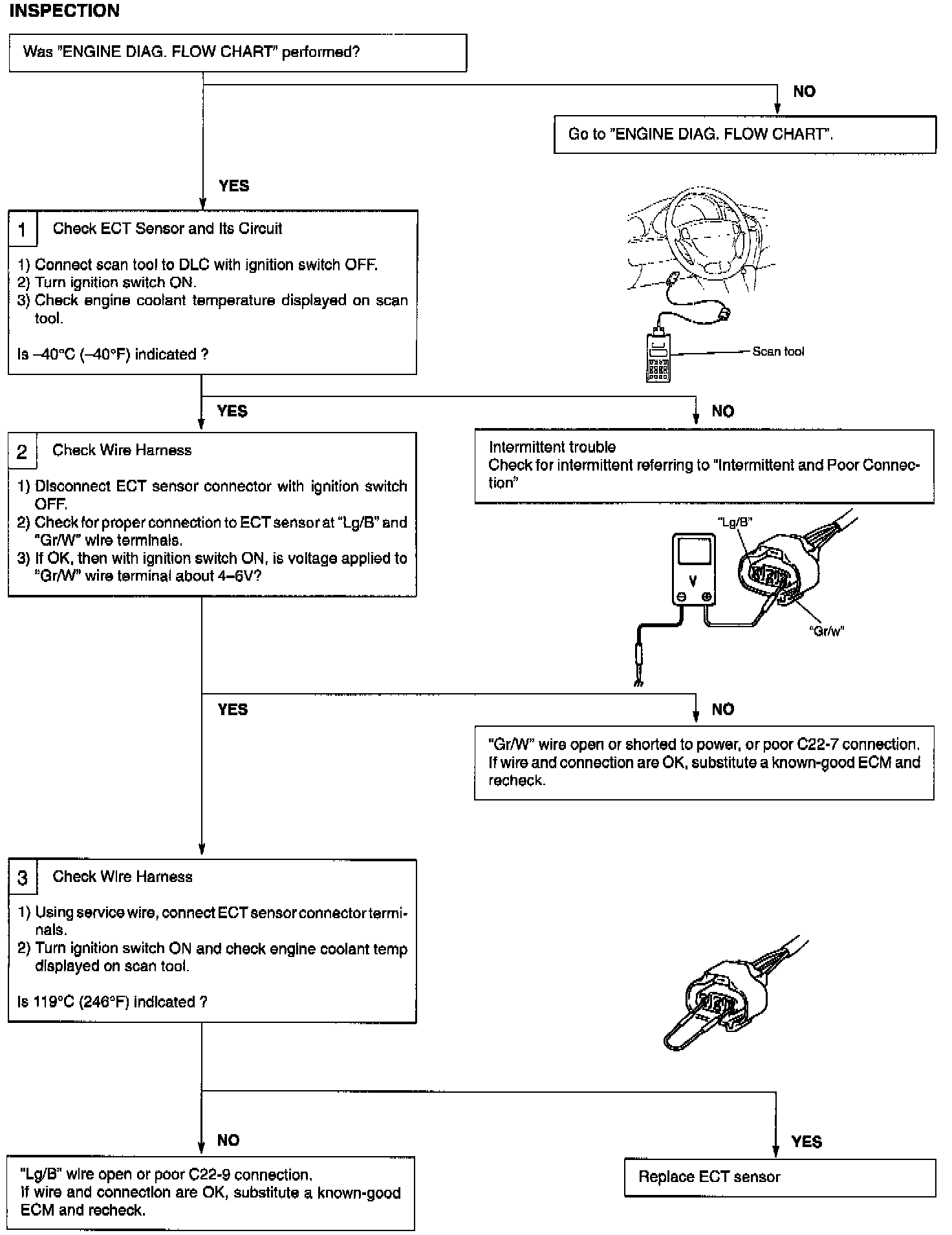 Engine Coolant Temperature Sensor (ECT Sensor) Located at the side of thermostat case, this sensor measures the temperature of the engine coolant and convents its change into that in resistance through the thermistor like the air temperature sensor. That is, as coolant temperature lowers, resistance increases and as it rises, resistance decreases. By monitoring the resistance of the coolant temperature sensor, ECM detects the engine coolant temperature and that affects most systems under the control of ECM.