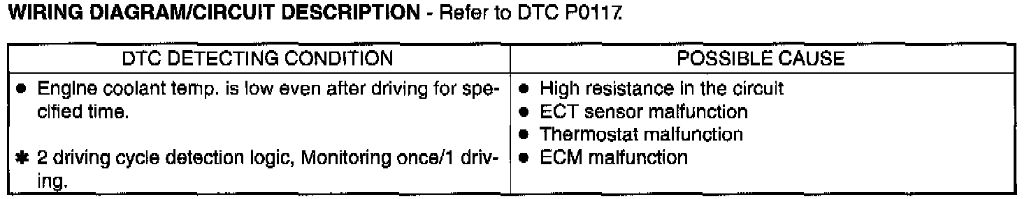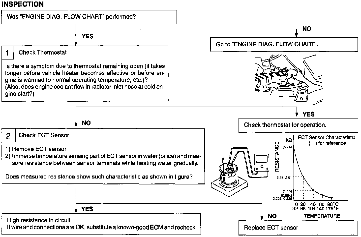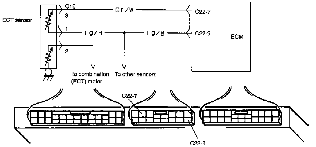 Engine Coolant Temperature Sensor (ECT Sensor) Located at the side of thermostat case, this sensor measures the temperature of the engine coolant and convents its change into that in resistance through the thermistor like the air temperature sensor. That is, as coolant temperature lowers, resistance increases and as it rises, resistance decreases. By monitoring the resistance of the coolant temperature sensor, ECM detects the engine coolant temperature and that affects most systems under the control of ECM.