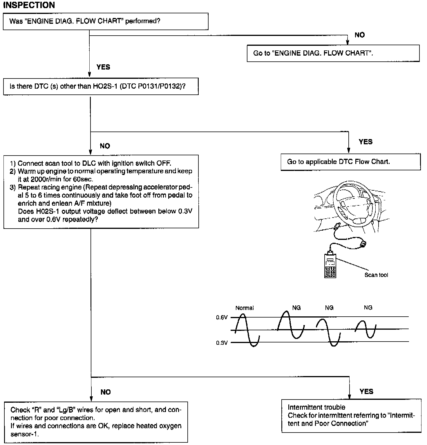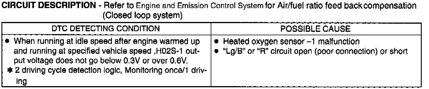 1. When oxygen concentration in the exhaust gas is low, that is, when the air/fuel ratio is smaller than the theoretical air/fuel ratio (fuel is richer), electromotive force of the heated oxygen sensor increases and a rich signal is sent to ECM.