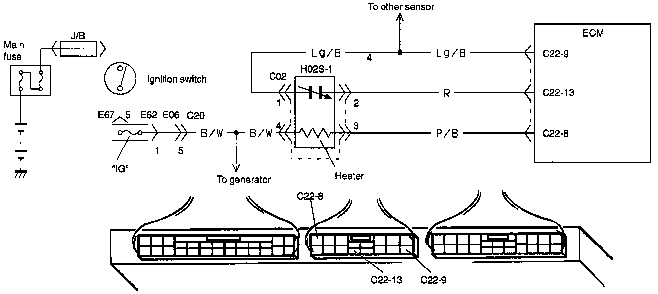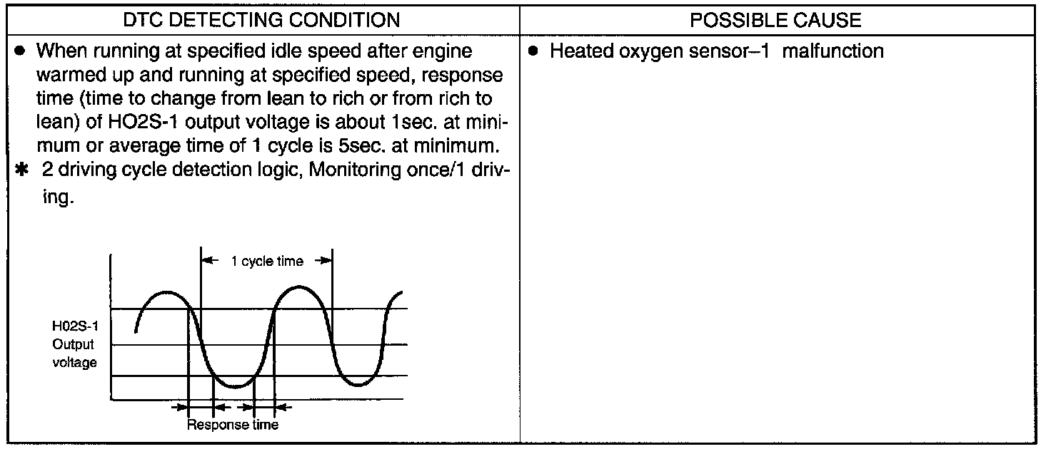 1. When oxygen concentration in the exhaust gas is low, that is, when the air/fuel ratio is smaller than the theoretical air/fuel ratio (fuel is richer), electromotive force of the heated oxygen sensor increases and a rich signal is sent to ECM.