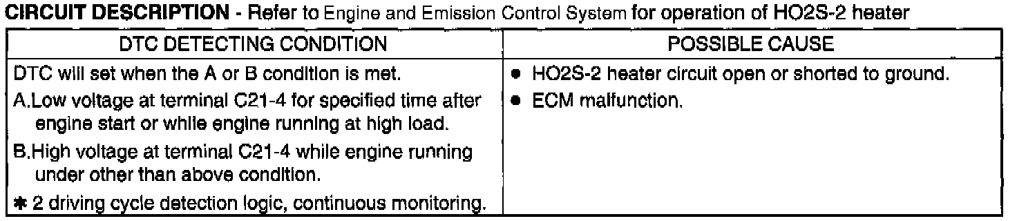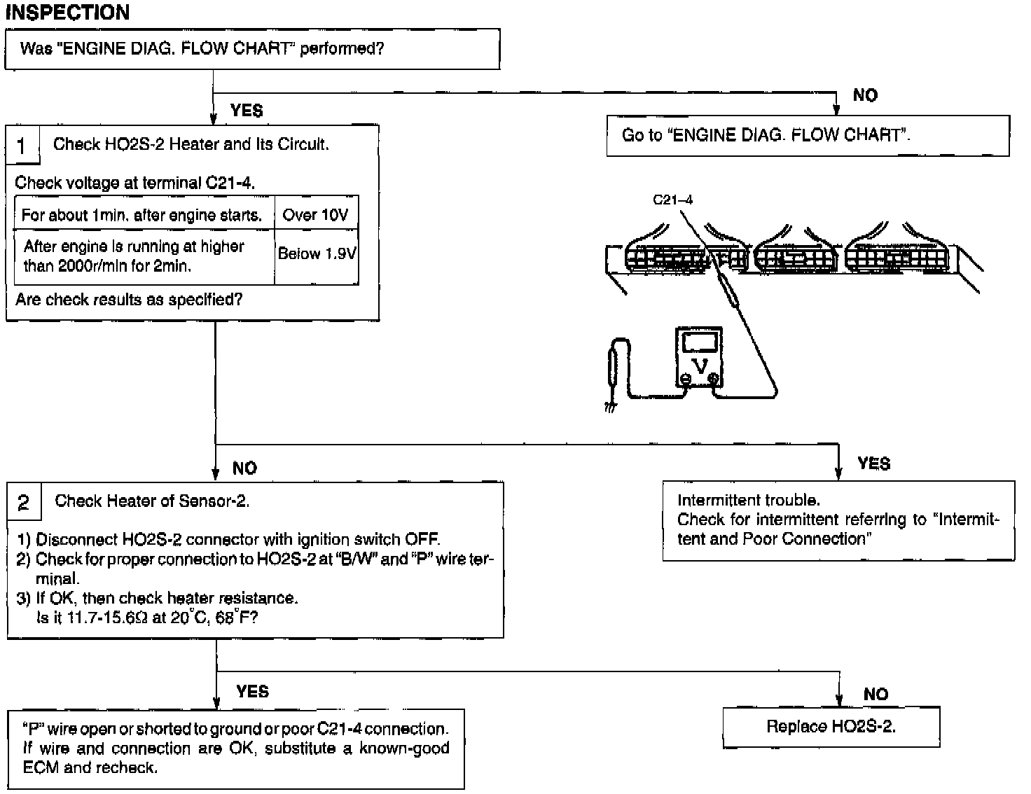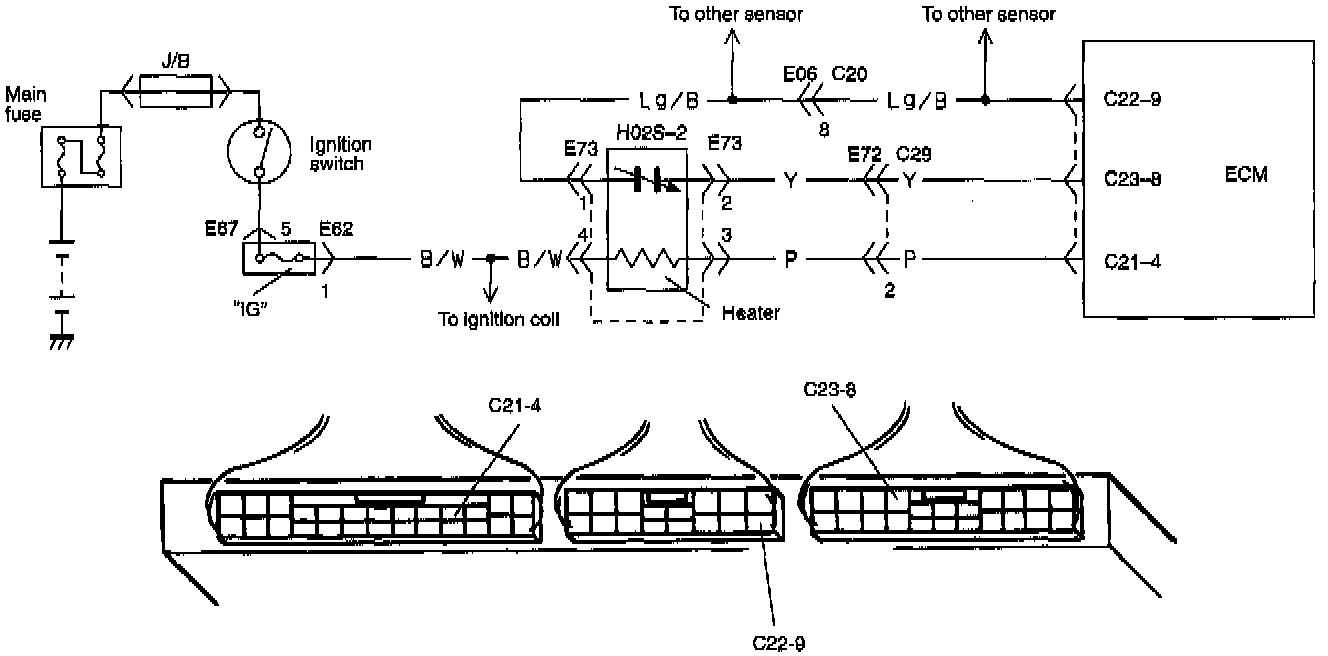 The oxygen sensor-1 is installed on the exhaust manifold (pre-catalyst) and the oxygen sensor-2 is installed on the exhaust pipe (post-catalyst). Each sensor detect the concentration of oxygen in the exhaust gases. ECM detects the air/fuel ratio of the mixture supplied to the engine by monitoring the signal (output voltage) from sensor-1. The signal (out-put voltage) from sensor-2 is used to detect malfunction of the three way catalytic converter. Each oxygen sensor heater promotes activation of the oxygen sensor.