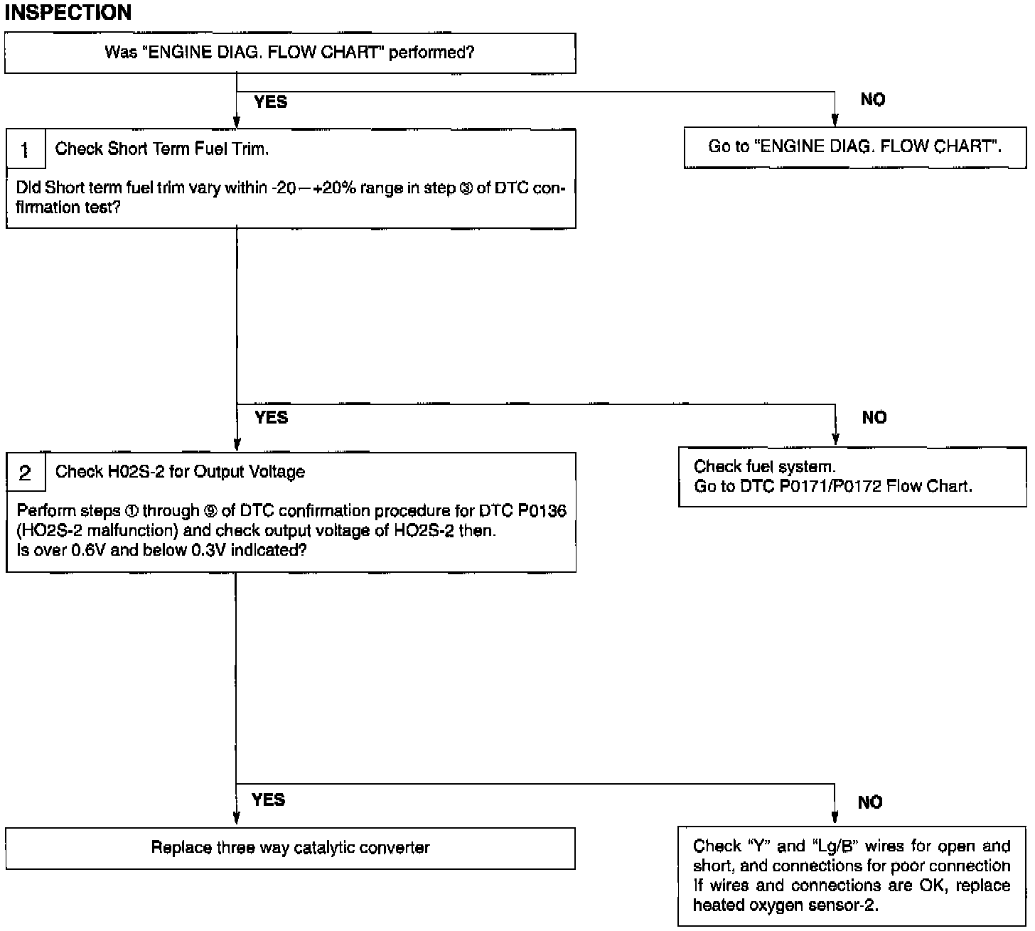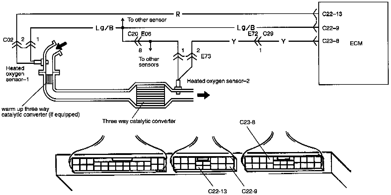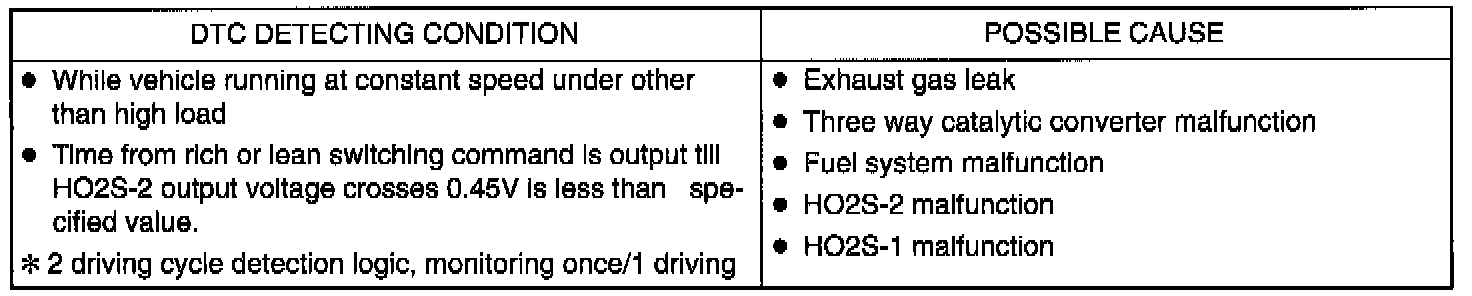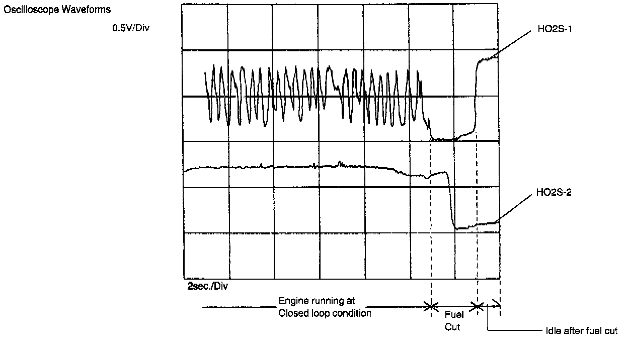 ECM monitors oxygen concentration in the exhaust gas which has passed the three way catalytic converter by HO2S-2. When the catalyst is functioning properly, the variation cycle of HO2S-2 output voltage (oxygen concentration) is slower than that of HO2S-1 output voltage because of the amount of oxygen in the exhaust gas which has been stored in the catalyst.