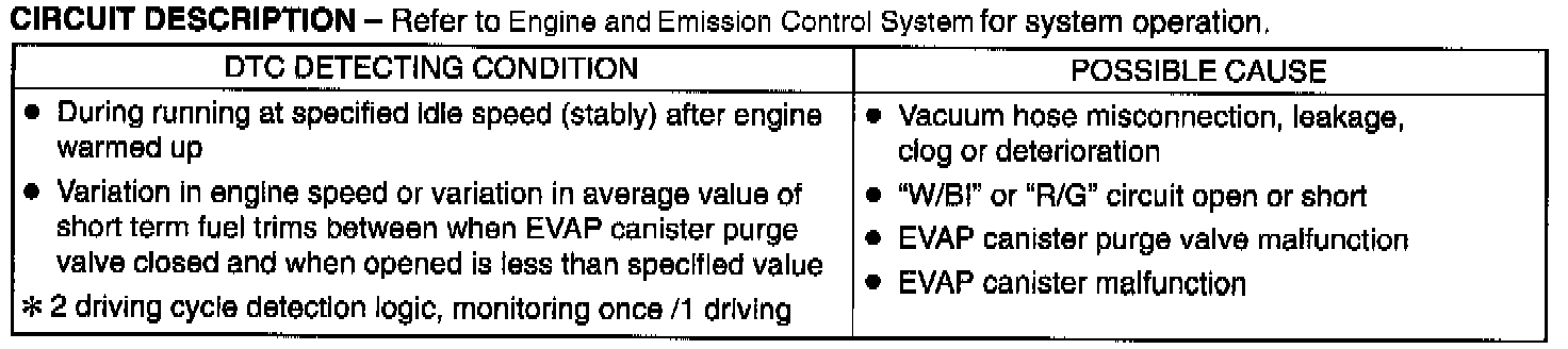 An evaporative emission control system is used to prevent emission of fuel vapor. The vapor generated in the fuel tank while driving or the engine at a stop passes through a tank pressure control valve and enters the EVAP canister where the charcoal absorbs and stores the fuel vapor. The EVAP canister purge valve is controlled as follows by ECM according to signals from various sensors.