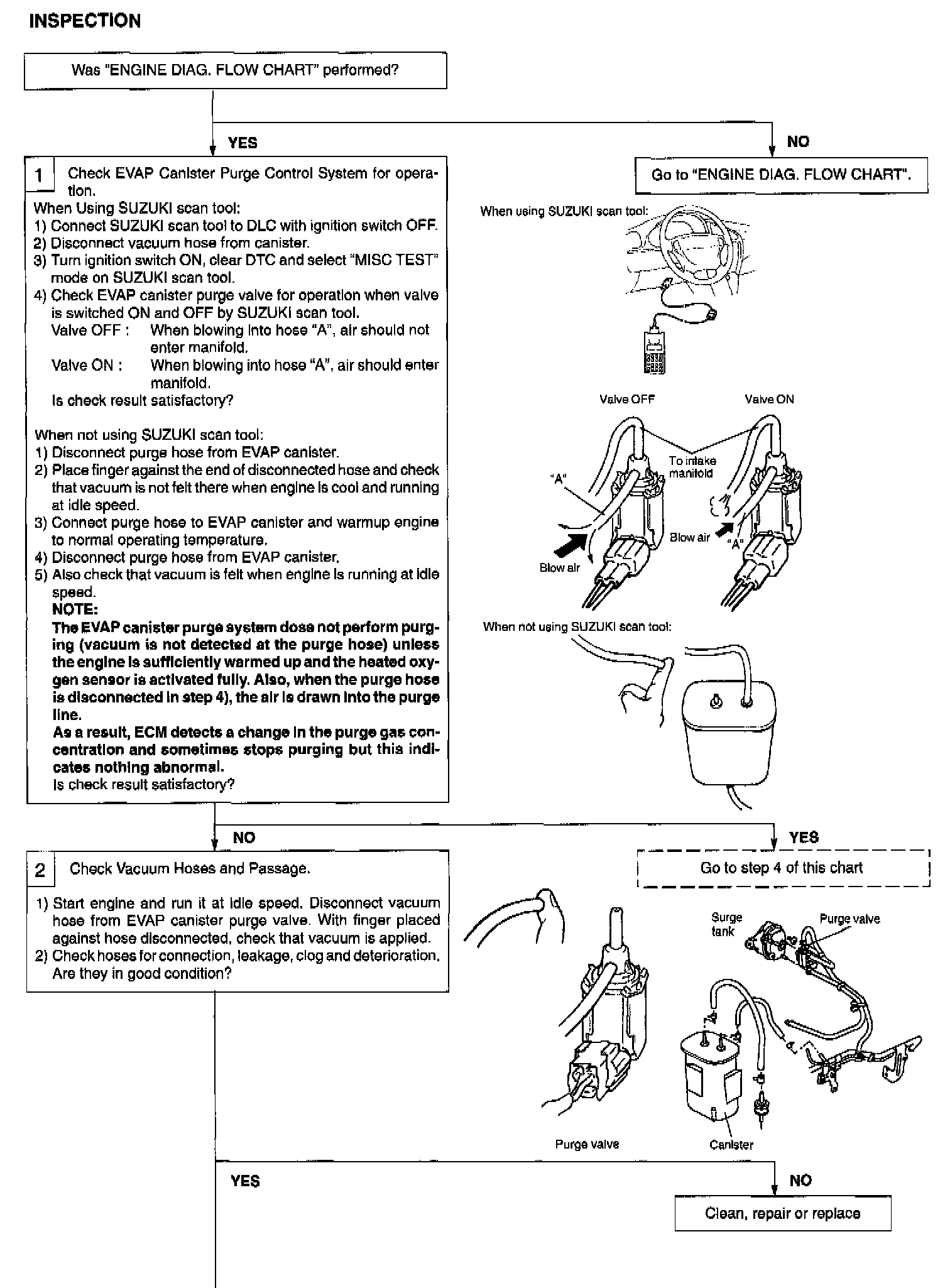 When the EVAP canister purge valve opens, fuel vapor in the EVAP canister is sucked into intake manifold. At this time, EVAP canister is purged or cleaned by the air drawn through the air pipe. The tank pressure control valve is provided to keep the pressure in the fuel tank constant. When the pressure in the fuel tank becomes positive and reaches its specified value, it opens the valve to let the vapor flow into the EVAP canister. On the other hand, when the pressure in the fuel tank becomes negative and reaches its specified value, it opens the valve to let the air flow into the fuel tank.