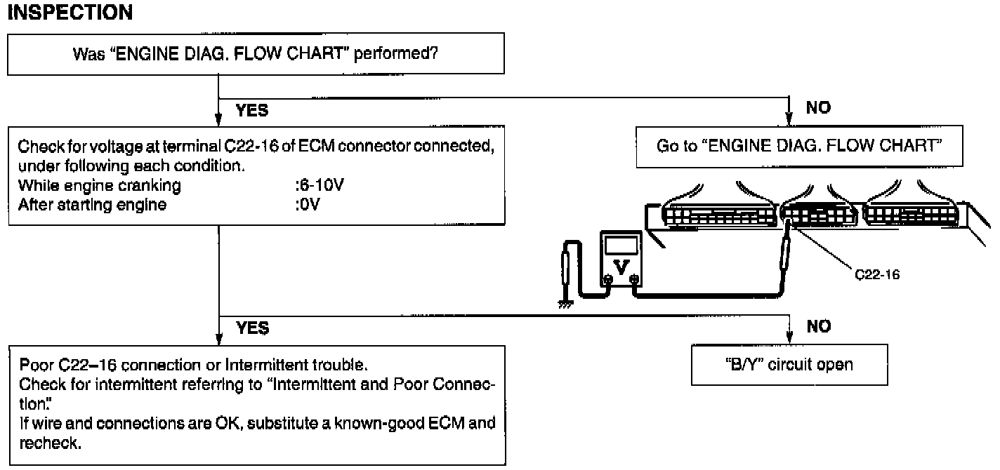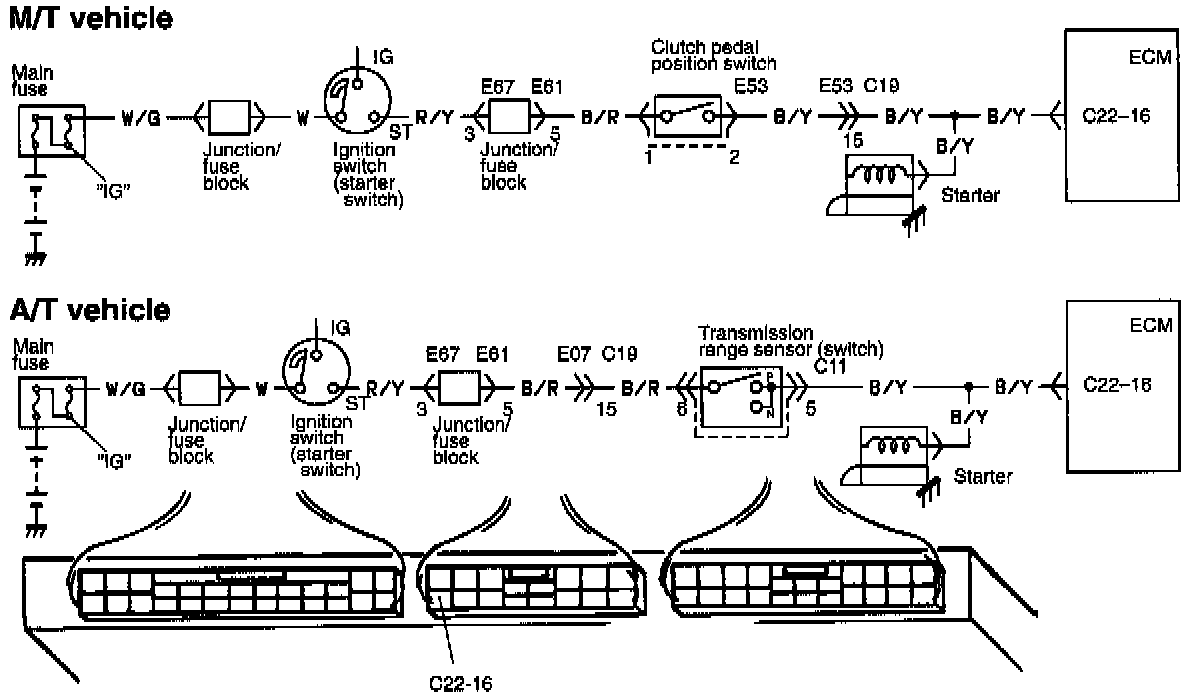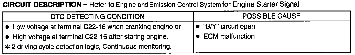 This signal is sent from the engine starter circuit. By receiving it, ECM judges whether the engine is cranking or not and uses it as one of the signals to control the fuel injector and fuel pump relay.
