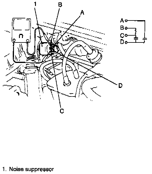- Disconnect coupler of noise suppressor.- Using ohmmeter, check to be sure that condensers are not conductive and resistor has resistance of about 2.2 k ohms.