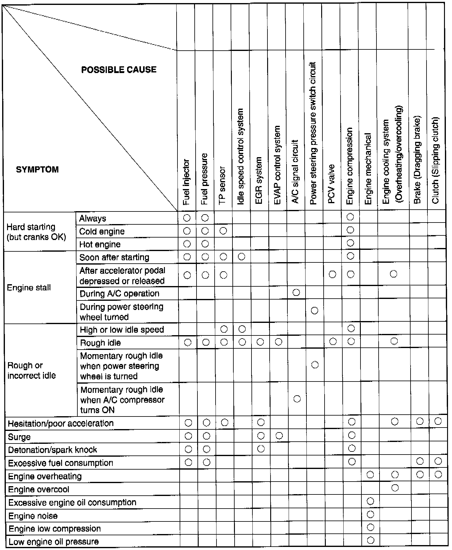 Perform troubleshooting referring to following table when ECM has detected no DTC and no abnormality has been found in visual inspection and engine basic inspection previously.