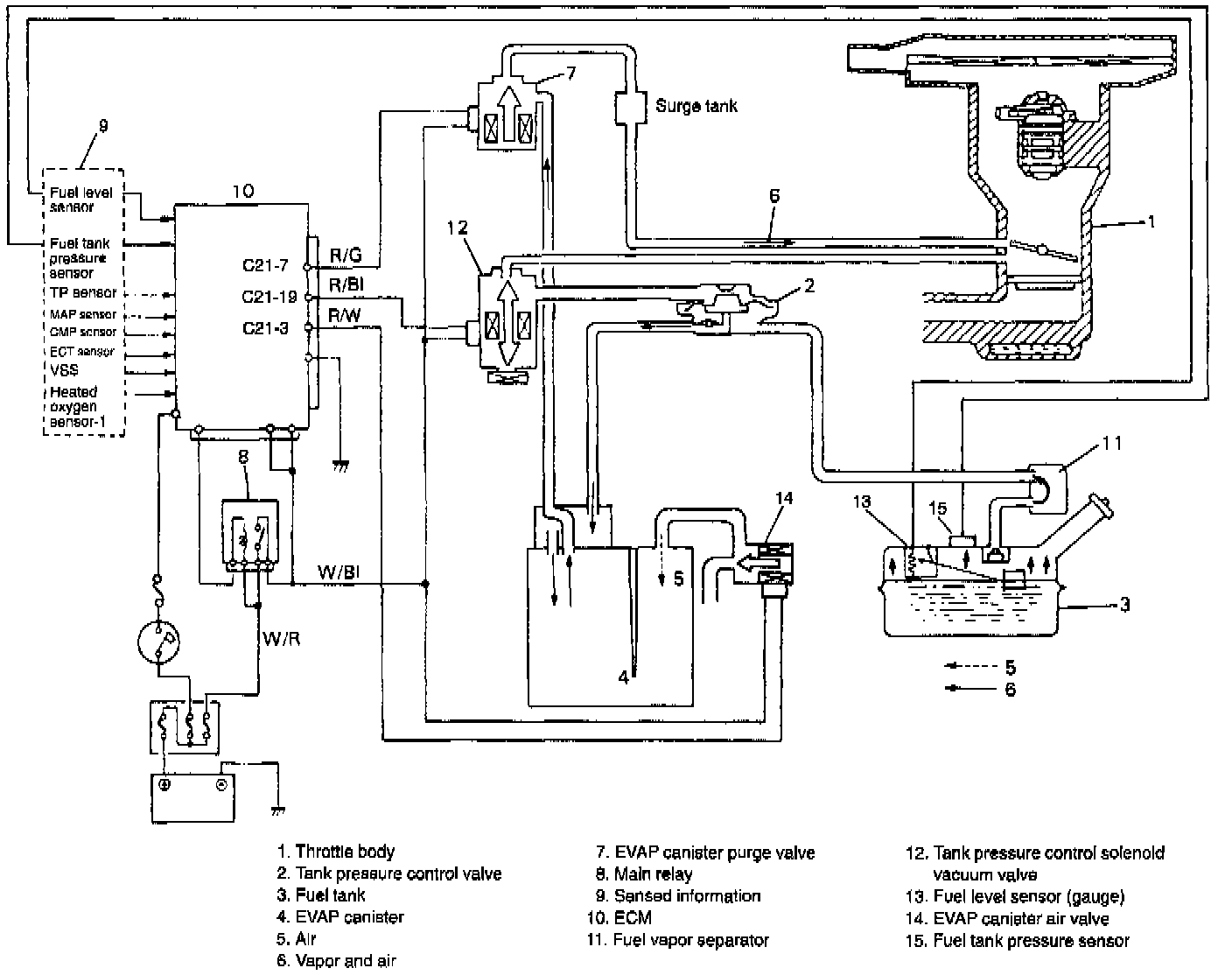 An evaporative emission control system is used to prevent emission of fuel vapor. The vapor generated in the fuel tank while driving or the engine at a stop passes through a tank pressure control valve and enters the EVAP canister where the charcoal absorbs and stores the fuel vapor. EVAP canister is purged or cleaned in the same way as EVAP control system for vehicle not equipped with tank pressure control solenoid vacuum valve. Tank pressure control valve operates as follows: As tank pressure control solenoid vacuum valve closes under the following either condition, vapor passage of tank pressure control valve also closes.
