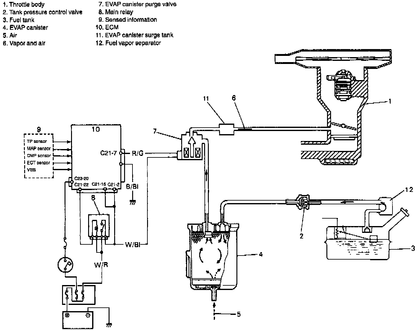 When the EVAP canister purge valve opens, fuel vapor in the EVAP canister is sucked into intake manifold. At this time, EVAP canister is purged or cleaned by the air drawn through the air pipe. The tank pressure control valve is provided to keep the pressure in the fuel tank constant. When the pressure in the fuel tank becomes positive and reaches its specified value, it opens the valve to let the vapor flow into the EVAP canister. On the other hand, when the pressure in the fuel tank becomes negative and reaches its specified value, it opens the valve to let the air flow into the fuel tank.