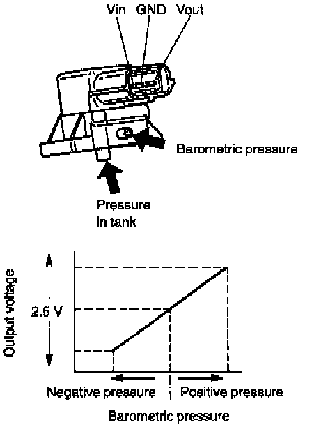 The sensor is installed on the fuel tank. It senses the fuel vapor pressure in the fuel tank as compared with barometric pressure and converts it into voltage signal. ECM uses this signal as one of the signals to detect the EVAP system malfunction.