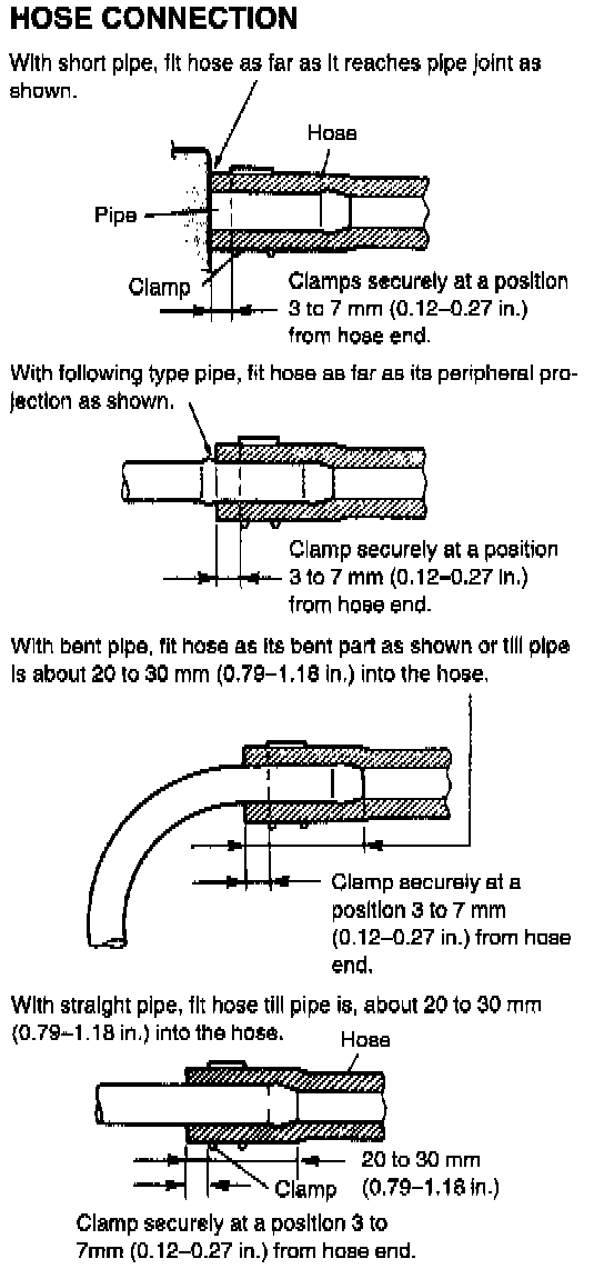 - Fuel or fuel vapor hose connection varies with each type of pipe. When reconnecting fuel or fuel vapor hose, be sure to connect and clamp each hose correctly referring to the above image. After connecting, make sure that it has no twist or kink.
