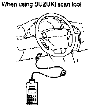 NOTE: Before starting engine, place transmission gear shift lever in "Neutral" (shift selector lever to "P" range for A/T model), and set parking brake.- When using SUZUKI scan tool, connect SUZUKI scan tool to DLC with ignition switch OFF.