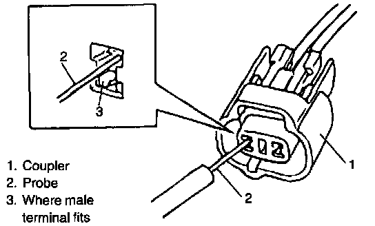 - When connecting meter probe from terminal side of coupler because it can't be connected from harness side, use extra care not to bend male terminal of coupler of force its female terminal open for connection. In case of such coupler as shown connect probe as shown to avoid opening female terminal. Never connect probe where male terminal is supposed to fit.