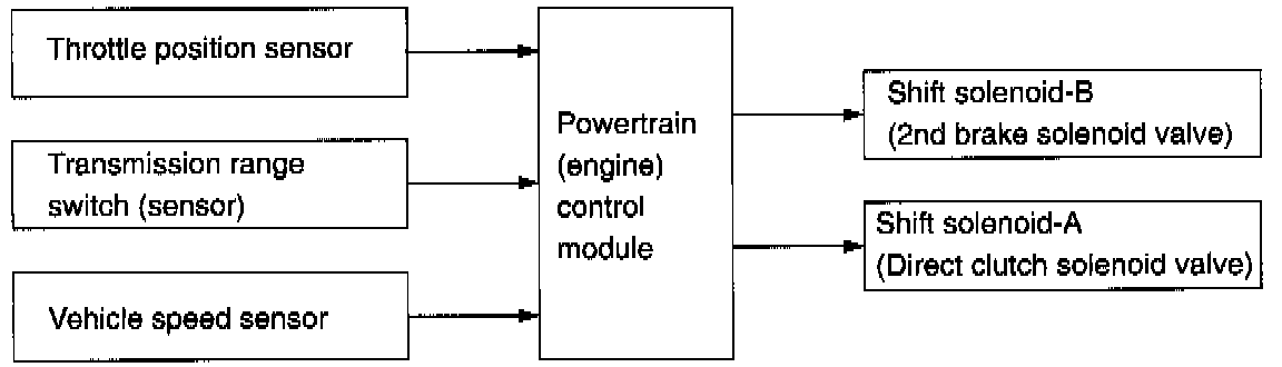 The powertrain (engine) control module controls the shift solenoid-B (2nd brake solenoid valve) and the shift solenoid-A (direct clutch solenoid valve) by sending electric signals to them so as to attain automatic gear shift between the 1st and 2nd gears, and the 2nd and 3rd gears. Equipped as [1][2]PCM sensed parameters are the throttle position sensor, transmission range switch (sensor) and vehicle speed sensor. These switch and sensors sense the throttle valve opening, selector lever's position and vehicle speed, and send those signals to the PCM. Then, the PCM opens and closes valves of the above solenoids according to these signals.