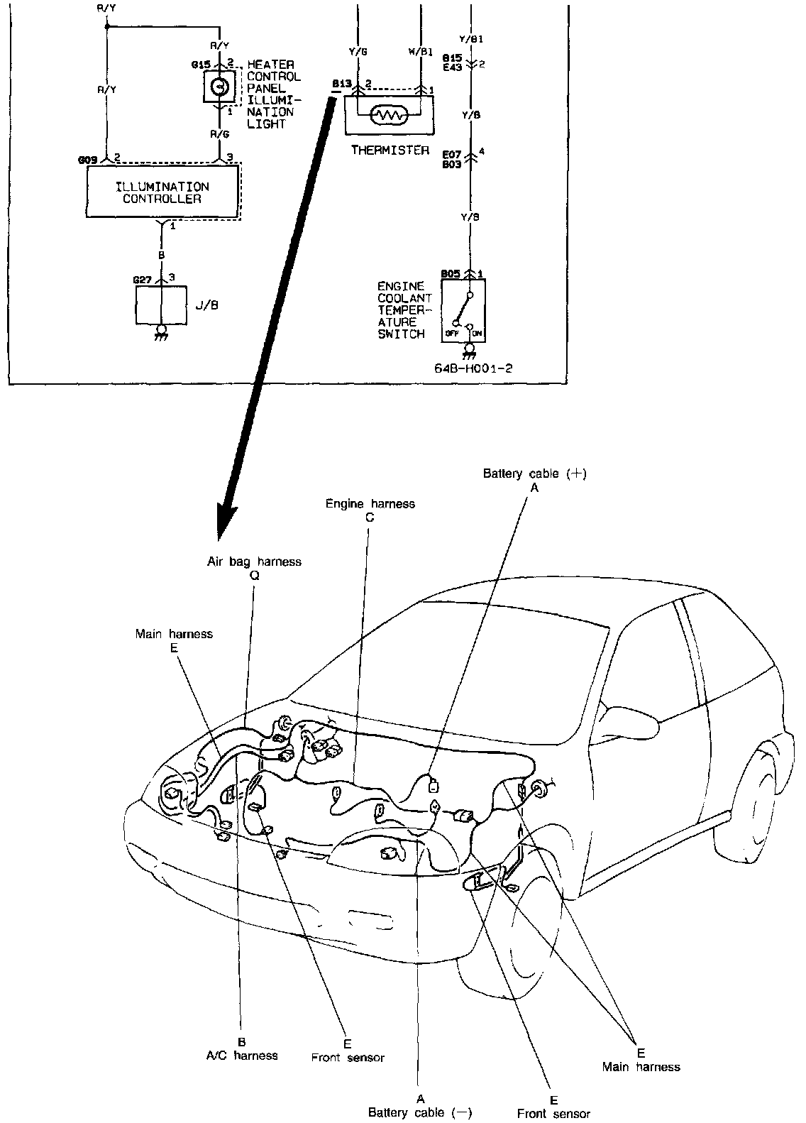 In the system circuit diagrams, alphabets (A, B, ..) are used as shown in the image. Alphabets are assigned to wiring harnesses in one to one correspondence so that if you know the alphabet, the harness name and its location in the vehicle can be retrieved simply by finding the same alphabet in the Harness Routing Diagram.