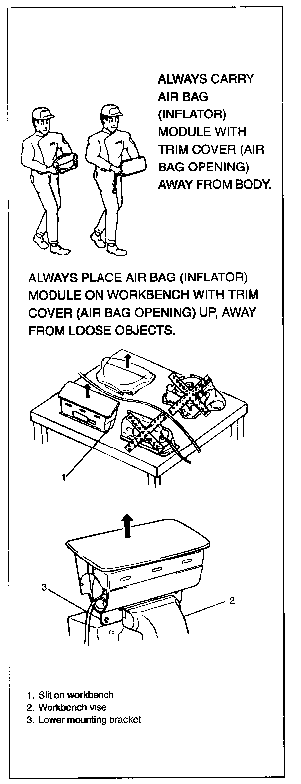- When carrying a live air bag (inflator) module, make sure the bag opening is pointed away from you. In case of an accidental deployment, the bag will then deploy with minimal chance of injury. Never carry the air bag (inflator) module by the wires or connector on the underside of the module. When placing a live air bag (inflator) module on a bench or other surface, always face the bag up, away from the surface. As the live passenger air bag (inflator) module must be placed with its bag (trim cover) facing up, place it on the workbench with a slit or use the workbench vise to hold it securely at its lower mounting bracket. This is necessary so that a free space is provided to allow the air bag to expand in the unlikely event of accidental deployment. Otherwise. personal injury may result.