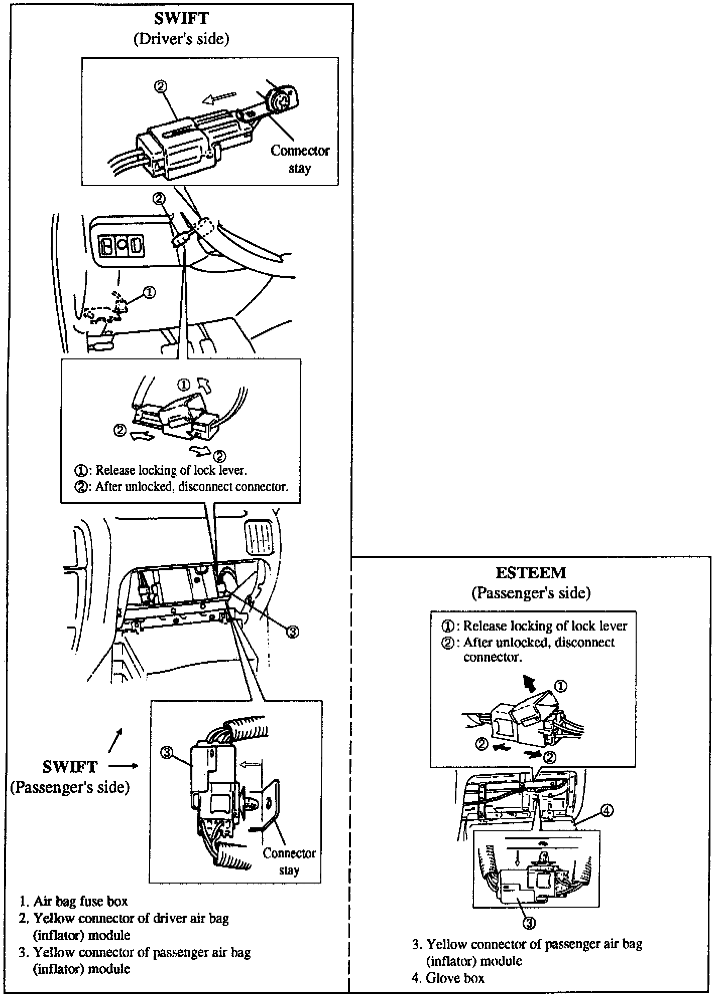 5. Pull out the glove box while pushing its stopper from both right and left sides and disconnect Yellow connector of passenger air bag (inflator) module.