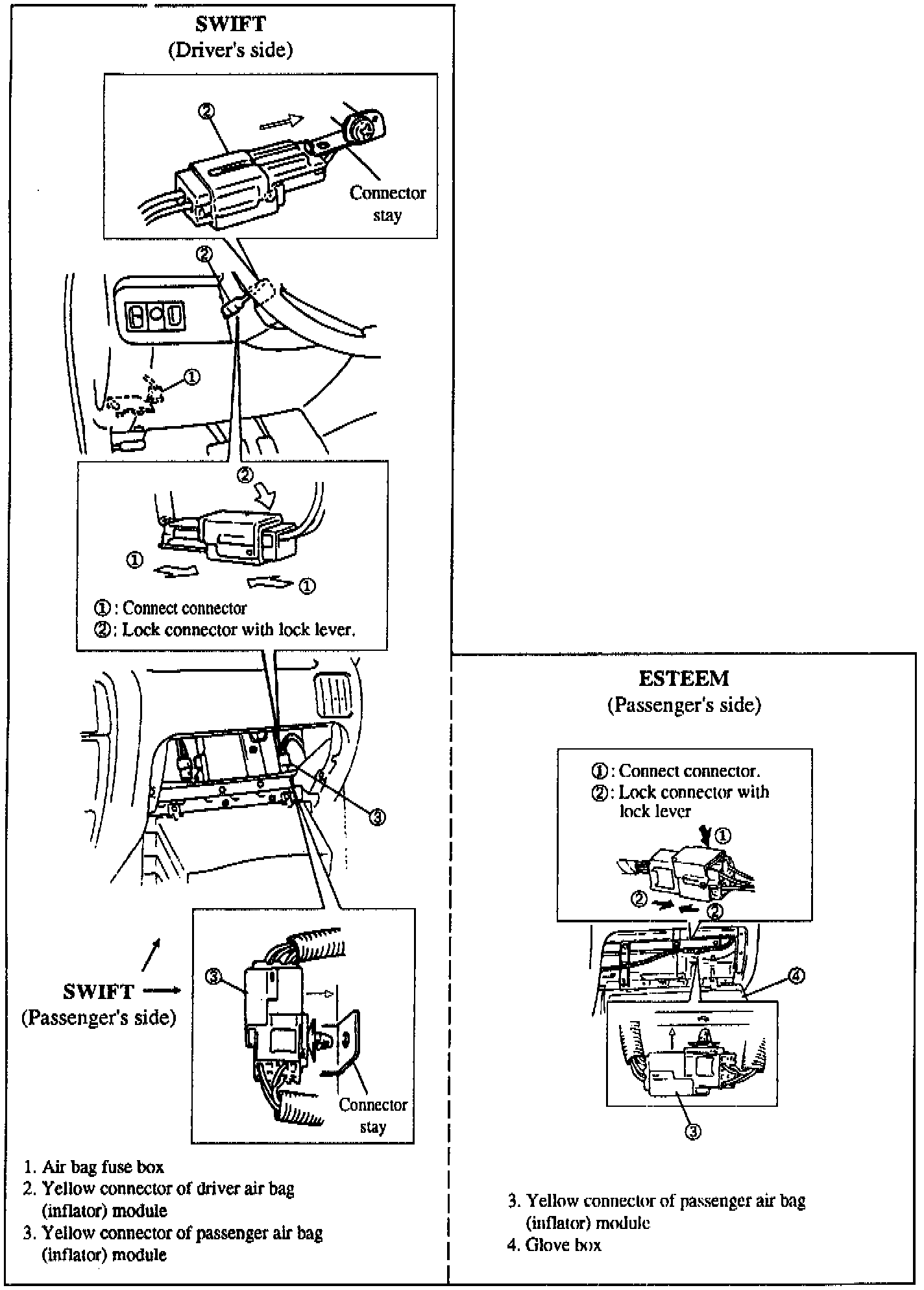 2. Connect Yellow connector of passenger air bag (inflator) module and Yellow connector of the driver air bag (inflator) module respectively, and be sure to lock each connector with lock lever.