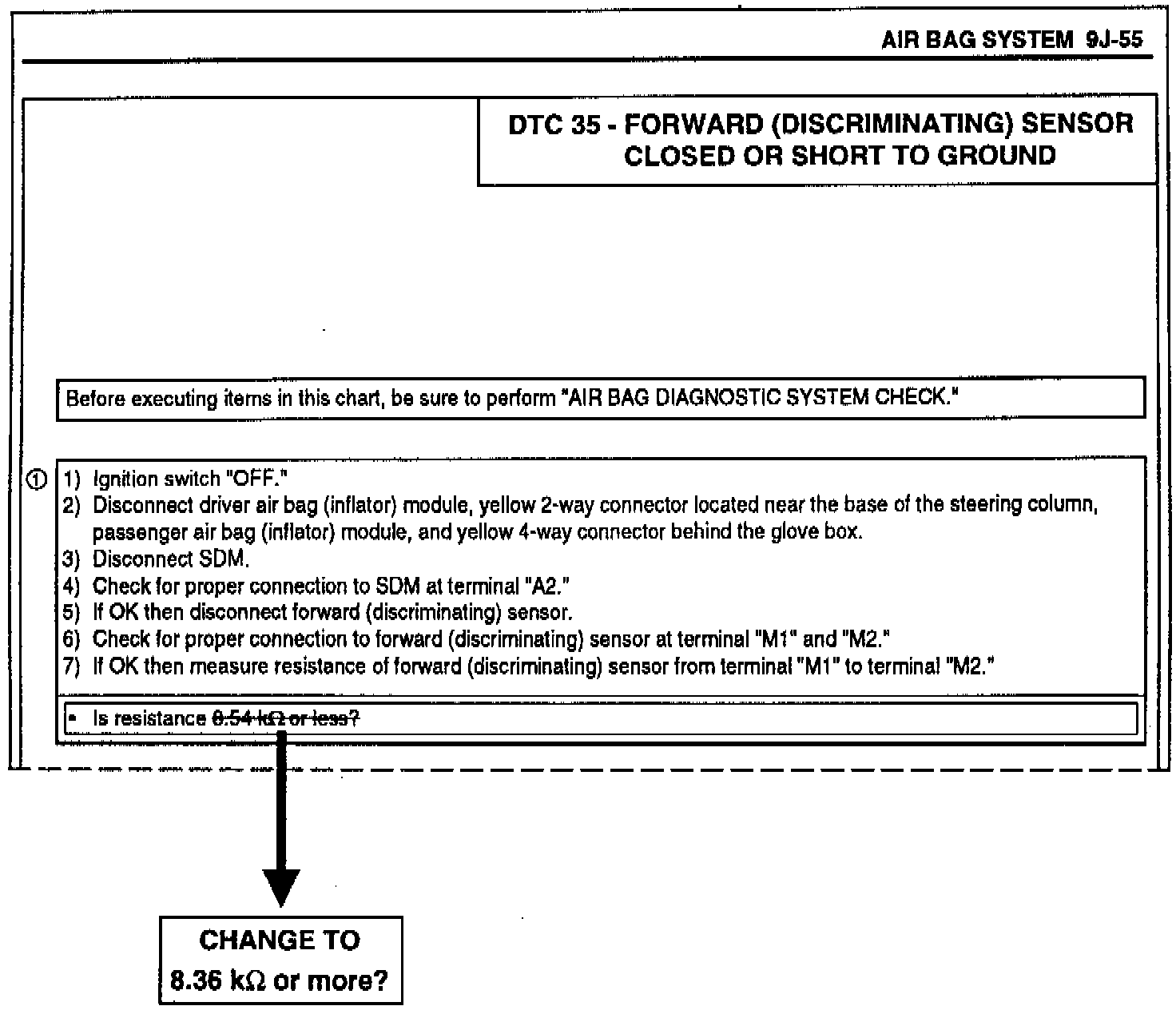 This bulletin is to inform you of the amendment of the "DTC 35 - FORWARD (DISCRIMINATING) SENSOR CLOSED OR SHORT TO GROUND" flow chart as described on p. 9J-55 in the 1996 Swift Supplementary Manual (99501-51G10-33E). Please make the necessary changes in your service manual as listed in this bulletin.