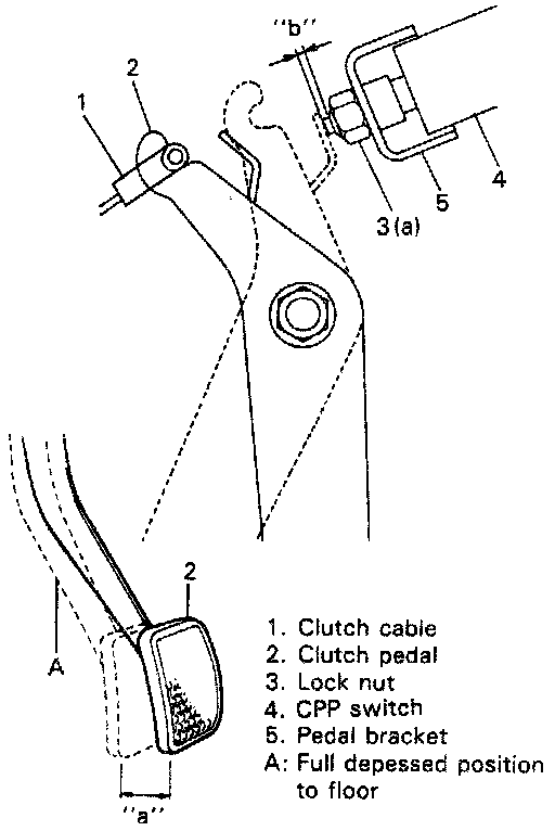 ^ When clutch pedal is fully depressed, clearance "b" (remaining switch stroke) should be 1.0 - 2.0 mm (0.04 - 0.08 inch)