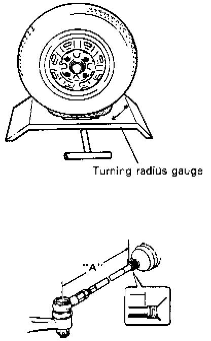 When tie rod or tie rod end was replaced, check toe and then also steering angle with turning radius gauge. If steering angle is not correct, check if right and left tie rods are equal in length ("A").