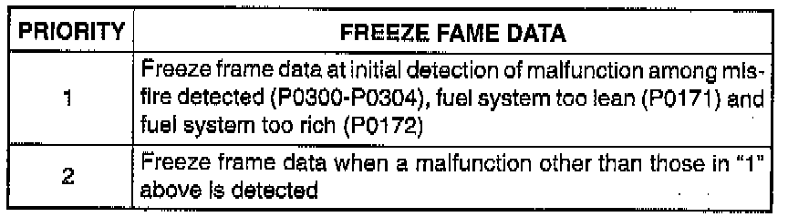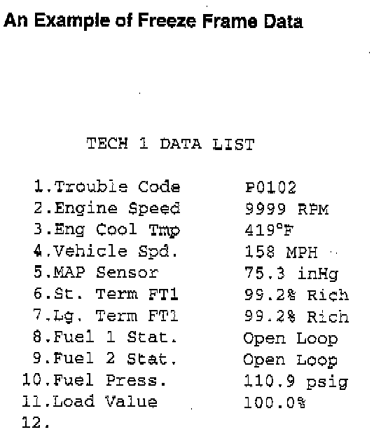 Therefore, it is possible to know engine and driving conditions (e.g., whether the engine was warm or not, whether the vehicle was running or stopped, whether air/fuel mixture was lean or rich, etc.) when a malfunction was detected by checking the freeze frame data. Its use is helpful when rechecking or diagnosing a trouble.