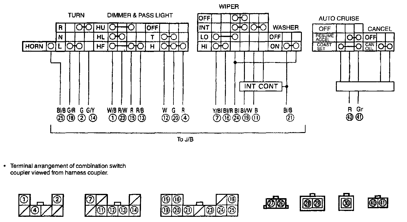 3) Use a circuit tester to check the continuity at each switch position. If any continuity is not obtained, replace switch.