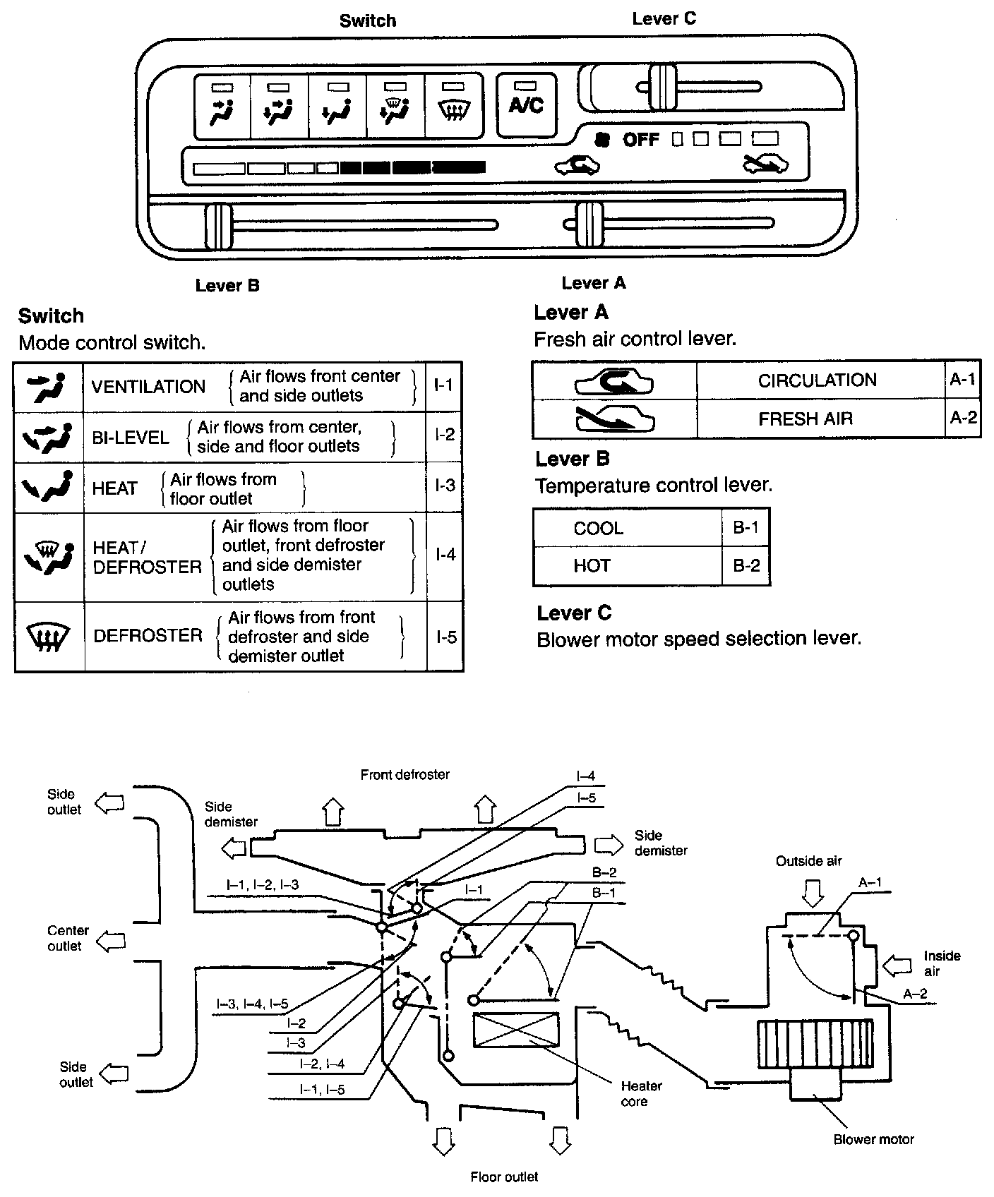 The heater and ventilation provide temperature control, ventilation and defrosting functions. Their operation is controlled by selecting the positions of the control levers and mode select switch on the instrument panel. Each lever/switch position and function of heater and ventilation are as given above.