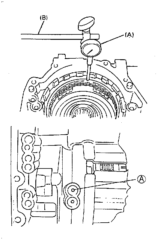 Measure 1st and reverse brake piston stroke by applying and releasing compressed air (400 - 800 kPa, 4 - 8 kg /CM2 , 57 - 113 psi) through oil hole section (A).