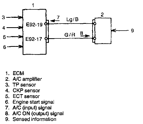 ECM outputs A/C ON signal (one of the signals for A/C amplifier to control the air conditioning) to A/C amplifier when A/C signal inputted to ECM and conditions listed below are satisfied.