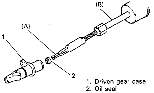 4. Remove oil seal by using special tools (Bearing remover and sliding hammer) holding flat portion of driven gear case by soft jawed vise.