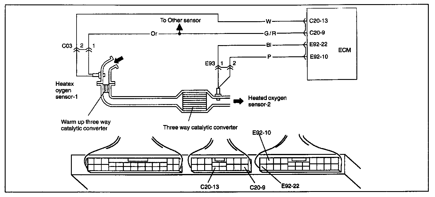 ECM monitors oxygen concentration in the exhaust gas which has passed the three way catalytic converter by HO2S-2.