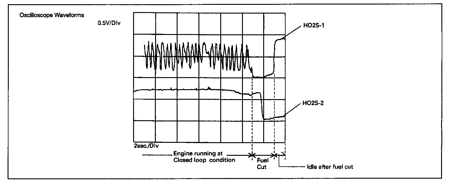 When the catalyst is functioning properly, the variation cycle of HO2S-2 output voltage (oxygen concentration) is slower than that of HO2S-1 output voltage because of the amount of oxygen in the exhaust gas which has been stored in the catalyst.