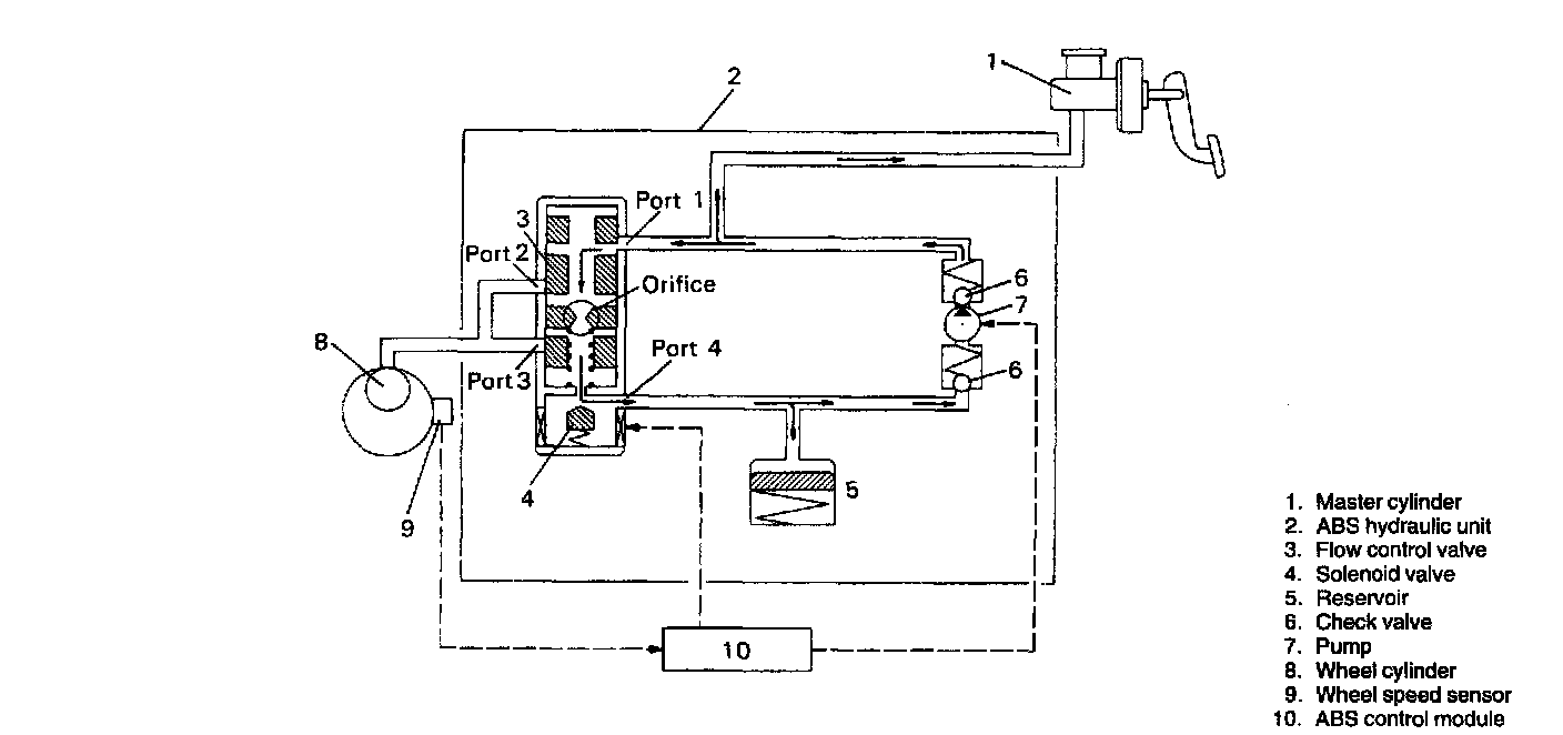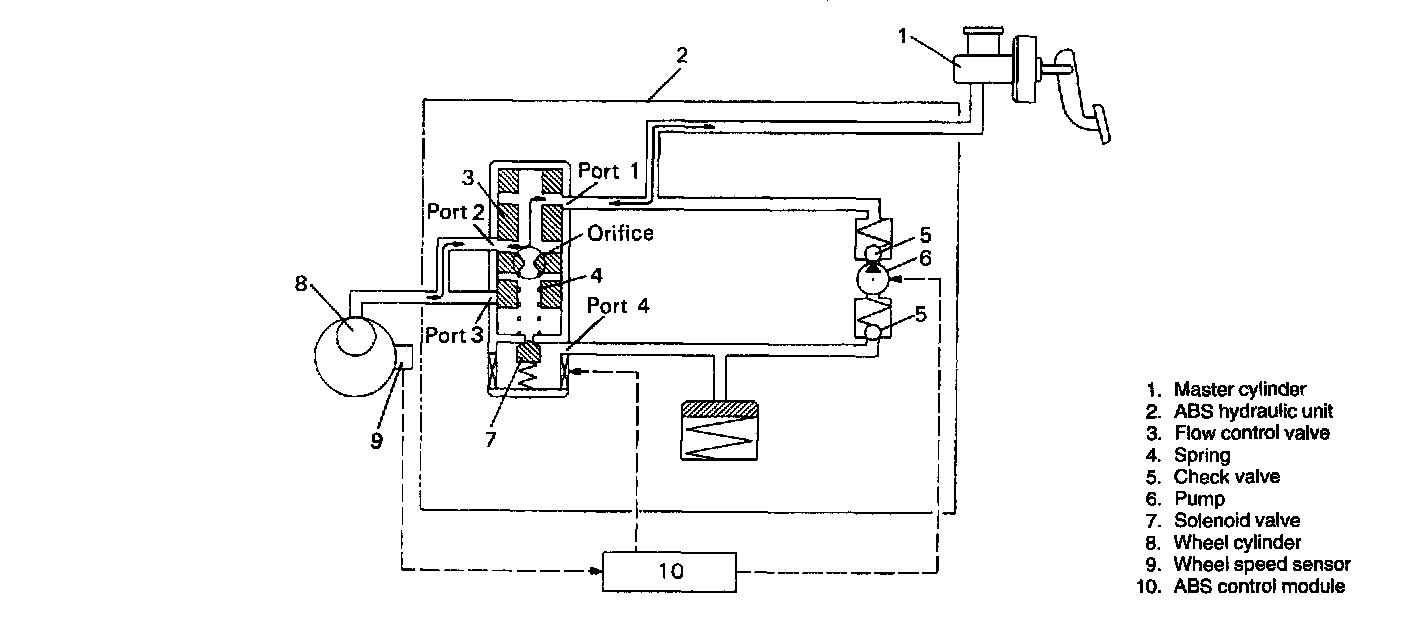When the wheel is about to lock, ABS control module opens the solenoid valve. At this time the brake fluid which remained under the orifice flows through Port 4 into the reservoir. Then, the pressure under the orifice becomes lower than that above it and the flow control valve is pushed down. As a result, Port 2 is closed to shut off the fluid pressure (fluid flow) to the wheel cylinder for an instant.