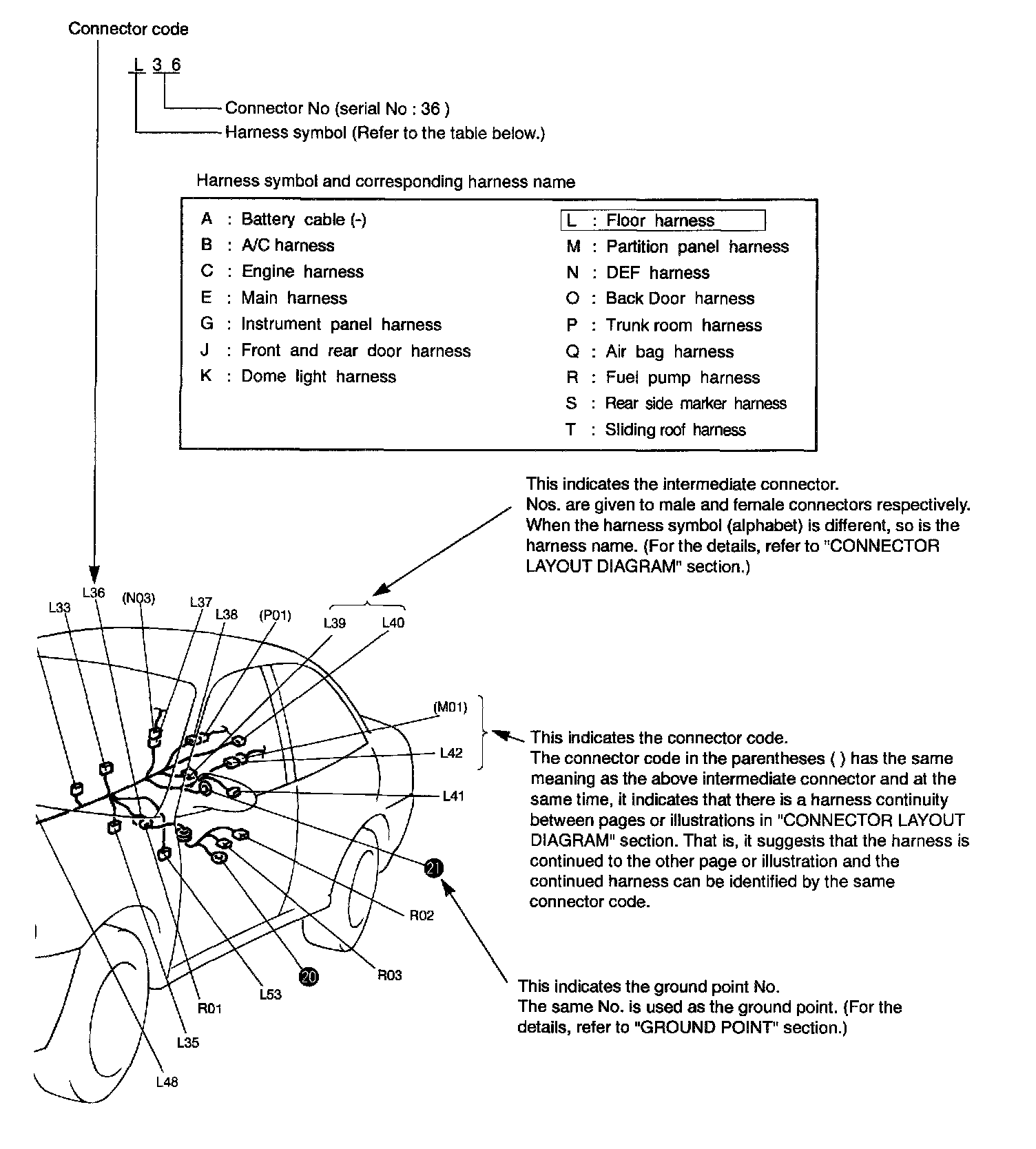 Each connector is identified by the code consisting of the harness symbol and the connector serial number. As each code is assigned to each connector in the system circuit diagram, it is easily possible to retrieve where the connector in question is located by using its code. To locate the connector, all you have to do is to look for the same code in Connector Layout Diagram.