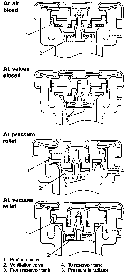 ^ It opens when the engine has cooled after being warmed up once and vacuum has occurred in the radiator so as to prevent the coolant level in the radiator from falling and the radiator from being collapsed due to the vacuum in it.