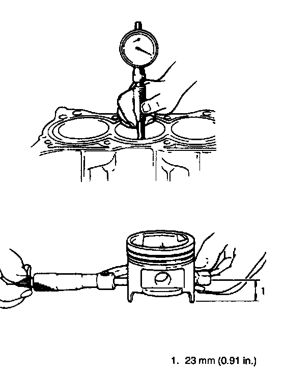 As indicated in figure, piston diameter should be measured at a position 23 mm (0.91 inch) from piston skirt end in the direction perpendicular to piston pin.