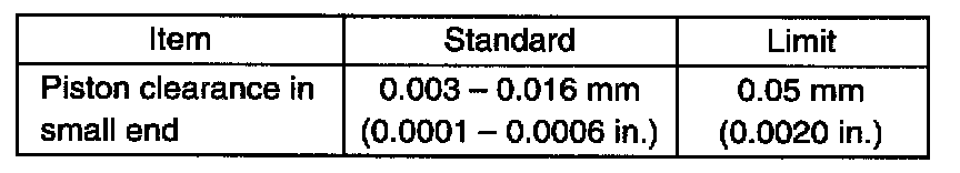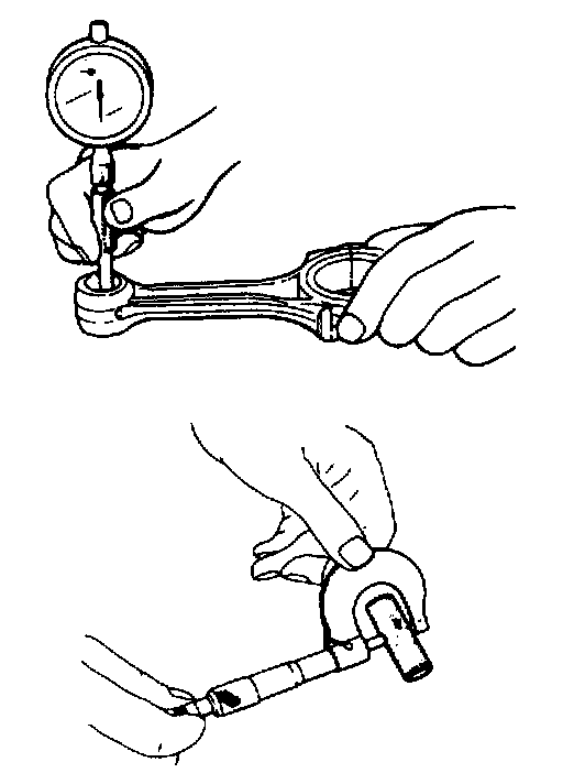 Check piston pin clearance in small end. Replace connecting rod if its small end is badly worn or damaged or if measured clearance exceeds limit.