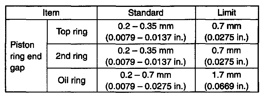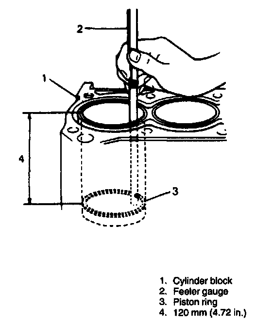 To measure end gap, insert piston ring into cylinder bore and then measure the gap by using thickness gauge. If measured gap is out of specification, replace ring.