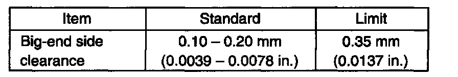 ^ Big-end side clearance: Check big-end of connecting rod for side clearance, with rod fitted and connected to its crank pin in the normal manner. If measured clearance is found to exceed its limit, replace connecting rod.