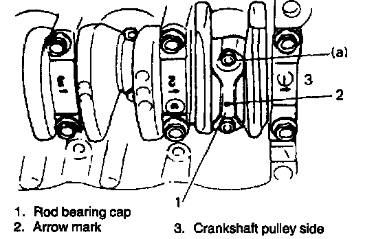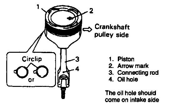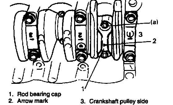 3. When installing piston and connecting rod assembly into cylinder bore, point arrow mark on piston head to crankshaft pulley side.