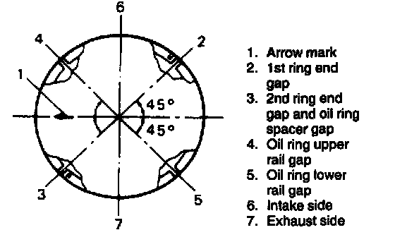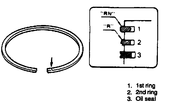 ^ As indicated in figure at the left, 1st and 2nd rings have "RN", "T" or "R" mark respectively. When installing these piston rings to piston, direct marked side of each ring toward top of piston.
