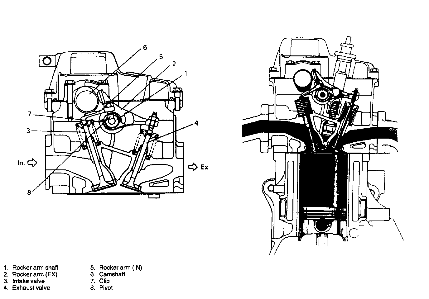 As the intake side rocker arm is end pivot type, it swings according to the camshaft movement to open and close the intake valve.
