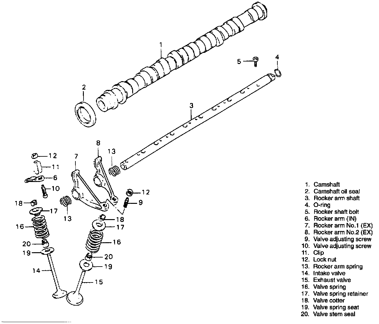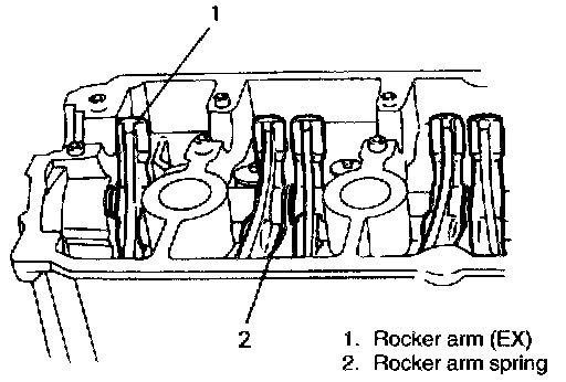 2. Install rocker arm shaft, rocker arm (exhaust side) and rocker arm spring.