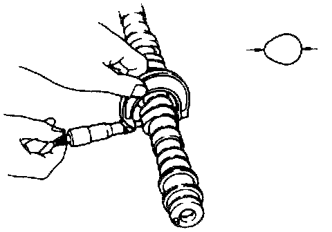 7. Apply engine oil to cams and journals on camshaft and put camshaft on cylinder head. Install camshaft housing to camshaft and cylinder head.