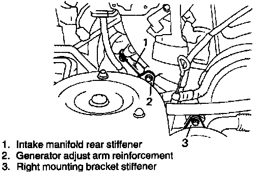 5. Remove intake manifold rear stiffener bolt, generator adjust arm reinforcement bolt and right mounting bracket stiffener bolt from intake manifold.