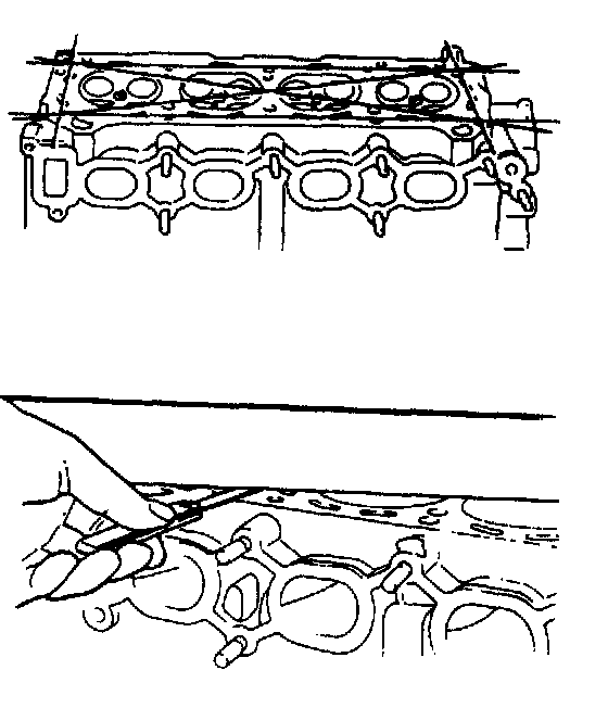 Check seating faces of cylinder head for manifolds, using a straightedge and thickness gauge, in order to determine whether these faces should be corrected or cylinder head replaced.